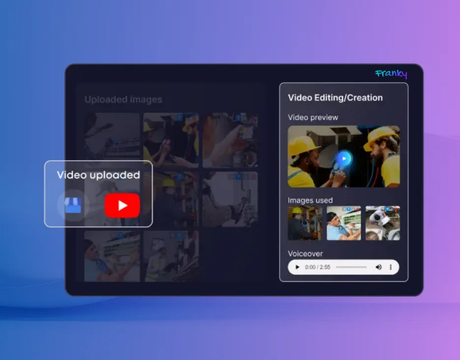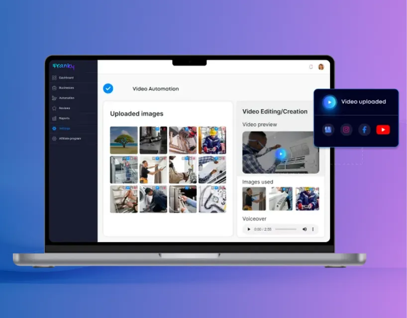 Franky takes the images you upload and turns them into slideshow videos that upload to your Google Business Profile, YouTube, Facebook, Instagram, and soon TikTok + LinkedIn pages. Video creation is 100% automated and great for ranking on Google AI Mode.