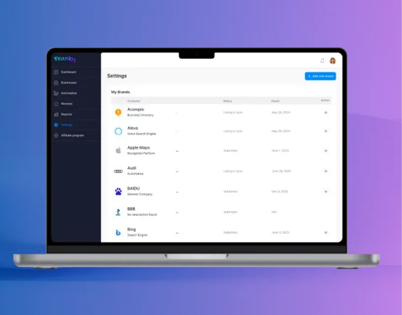 Takes a few minutes to set up. Most businesses see ranking improvements within 30 days. Once Franky is managing your profile, you'll never have to worry about local SEO again.
