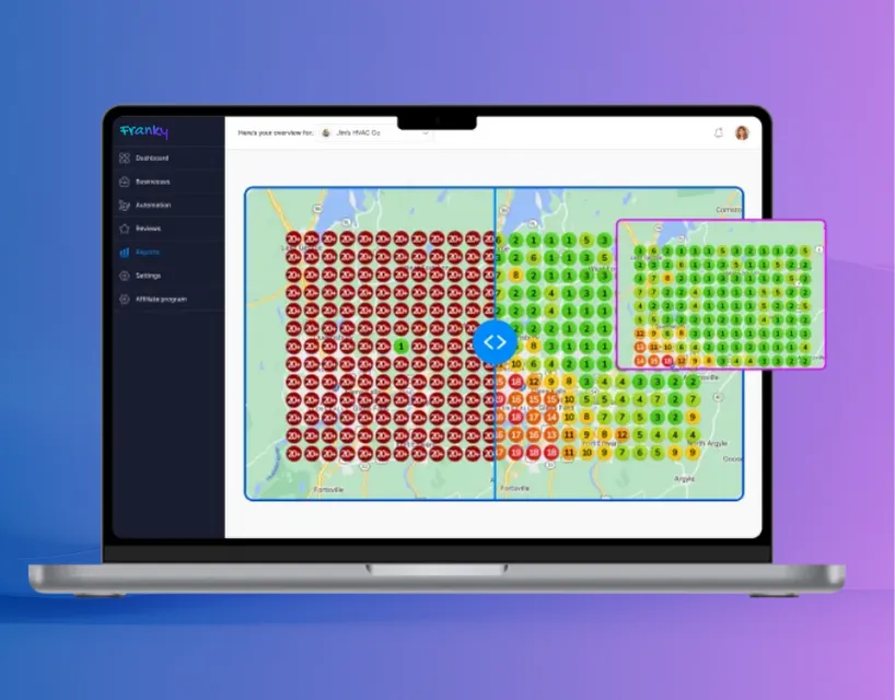 Franky tracks your Google Business Profile ranking improvements automatically and sends you ranking reports with heatmaps so you can see exactly how much your ranking is improving, thanks to Franky. The reports make local SEO 100% transparent for you.
