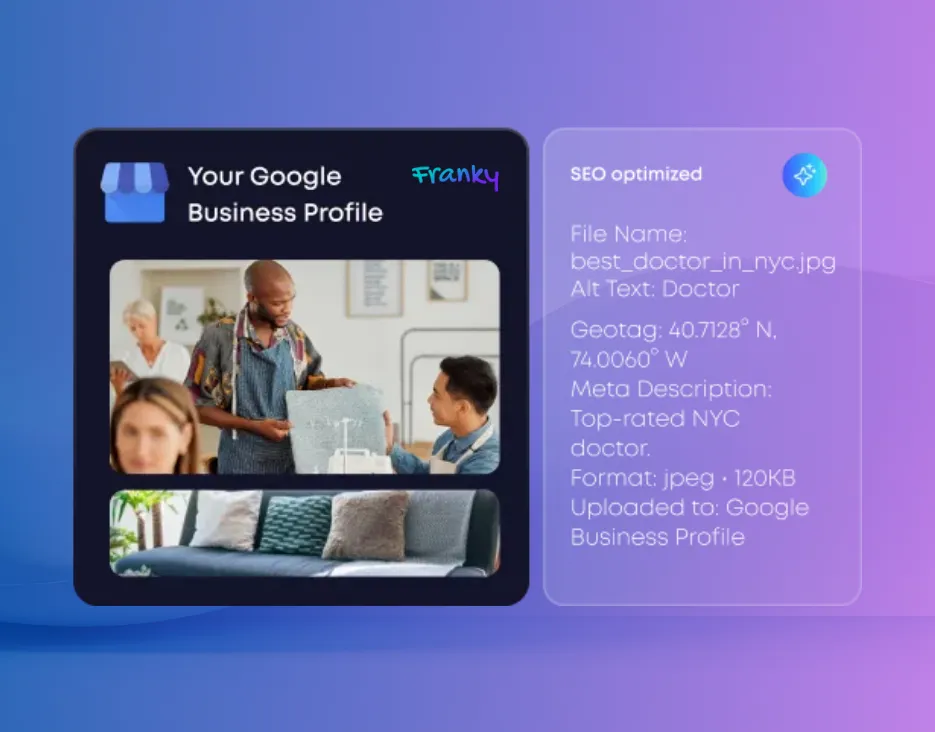 When you upload images to Franky, it optimizes them for your keywords. including their file names and meta descriptions. It then floods your local area by geotagging them & uploading to your Google Business Profile’s photos section at the optimal moment instead of all at once.