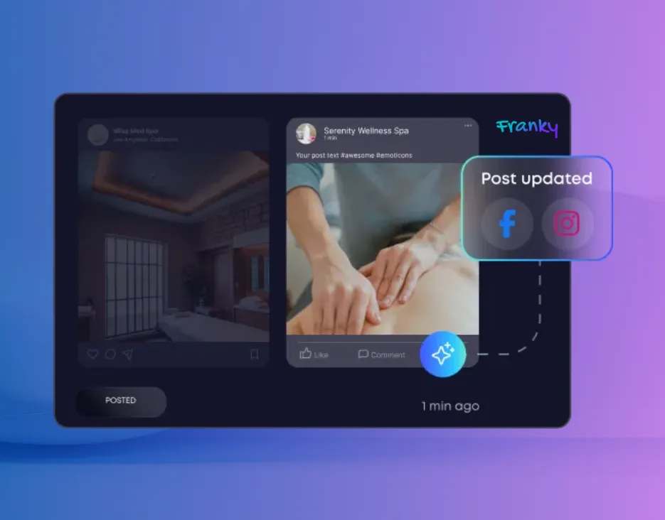 Franky takes the posts and videos it creates for your Google Business Profile and uploads them to all the social media platforms Google monitors. Franky can currently automate posts on Facebook & Instagram and will soon support LinkedIn and TikTok.